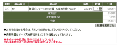 選ばれた商品は「商品名」「個数」「数量」「金額」などが買い物カゴにて表示されます。 買い物を続ける際は、「買い物を続けるボタン」を押してください。買い物中に「かごの中身」を確認したい場合は、各ページの右上にある「かごの中を見る」ボタンをクリックしていただくとご確認いただけます。お選び頂いた商品の数量変更する場合は、かごの中身画面の数量部分をご希望の数量に変更し「数量を更新する」ボタンを押してください。