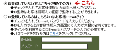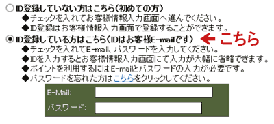 「ID登録している方はこちら」にチェックボタンを入れて、「E-mail」「パスワード」をご入力し、「お客様情報入力画面へ」ボタンを押して下さい。会員登録されているお客様は登録しているお客様情報が自動的に表示されます。