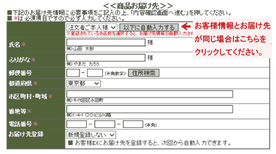 ご注文商品のお届け先を入力してください。お客様情報と商品お届け先が同じ場合、「注文者ご本人様 以下に自動入力」のボタンをクリックすると自動的に表示されます。